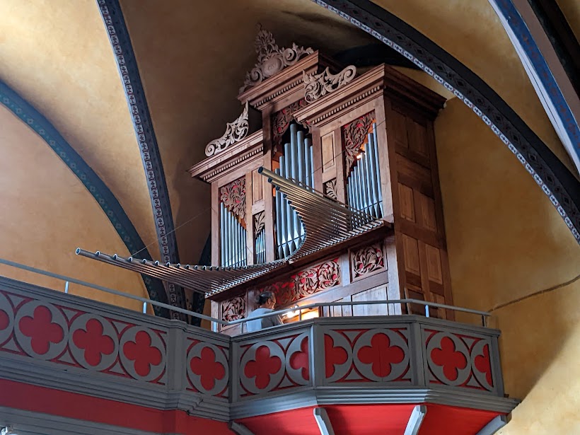 Baptiste Genniaux invite enfin l’assistance à le suivre jusqu’à la tribune de l’orgue ou s’instaure un dialogue autour d’une présentation détaillée de l’instrument avec application immédiate ! Bien des « secrets » de son fonctionnement sont alors dévoilés et expliqués. Les différents types de tuyaux, leur composition, leur disposition, l’utilisation des jeux et leur combinaison sont habilement décrits. Une attention particulière se porte sur les tuyaux en chamade, les plus spectaculaires, tant sur le plan visuel, que sur celui des sonorités. L’écoute au plus près de l’instrument en fournit une autre « vision auditive » que chaque spectateur apprécie à sa juste valeur. Un grand bravo pour l’initiative et sa réalisation !
