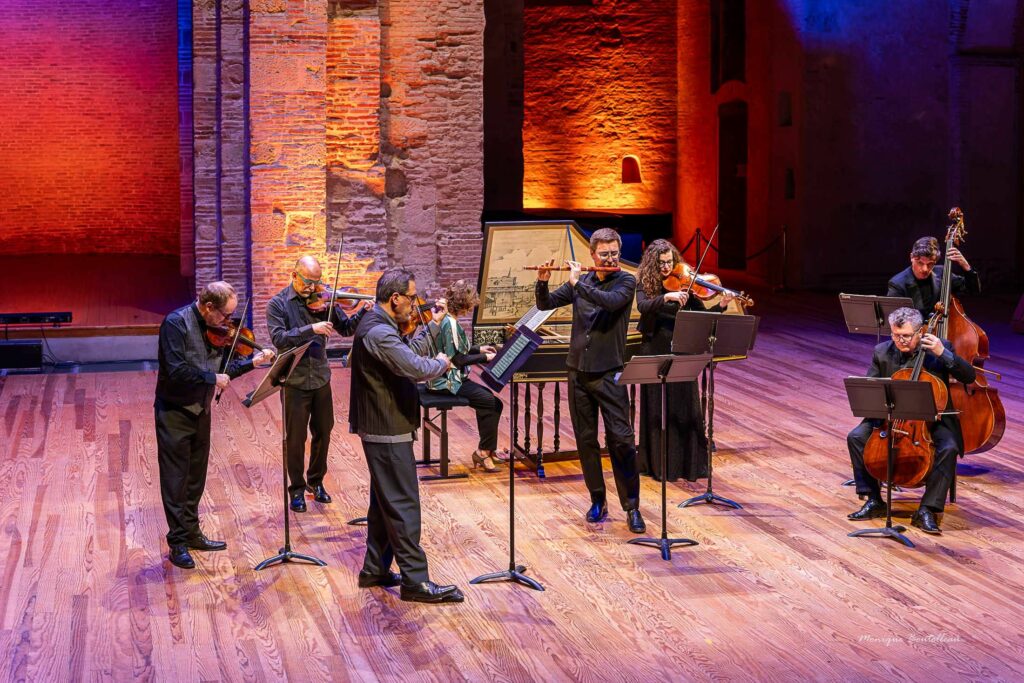 Le cœur du programme tournait bien sûr autour du Cantor : Johann Sebastian Bach. Après son concerto pour violon en la mineur BWV 1041 donné en première partie, ce sont deux de ses célèbres « brandebourgeois » qui occupaient toute la seconde partie de la soirée, le 5 en ré majeur BWV 1050 et le 4 en sol majeur BWV 1049.  Le premier cité nous a permis d’apprécier pleinement la virtuosité et la musicalité de la claveciniste française Céline Frisch dont l’instrument fut trahi par une sonorité discrète lors des autres pièces. Si toutes les cordes frottées, dont la rugosité naturelle n’entame en rien une éblouissante lumière,  sont à saluer pour leur énergie et leur discipline stylistique, il faut ainsi nommer le directeur et fondateur de cet ensemble l’Argentin Pablo Valetti (violon), le Français David Plantier (violon), l’Italien Mauro Lopes Ferreira (violon), l’Espagnole Núria Pujolràs (Alto), le Hongrois Balazs Maté (violoncelle) et l’Italien Davide Nava (contrebasse), ce sont clairement l’Allemand Michael Form (flûte à bec) et le Hongrois Karel Valter (traverso) qui furent les héros de cette soirée. Chacun sait les difficultés de pratique de ces instruments. Ici il n’y paraît rien tant la longueur du souffle, la souplesse de la mélodie, la rondeur du son, l’assise de ce dernier et surtout tous les affects que ces musiciens nous ont transmis semblent couler de source.