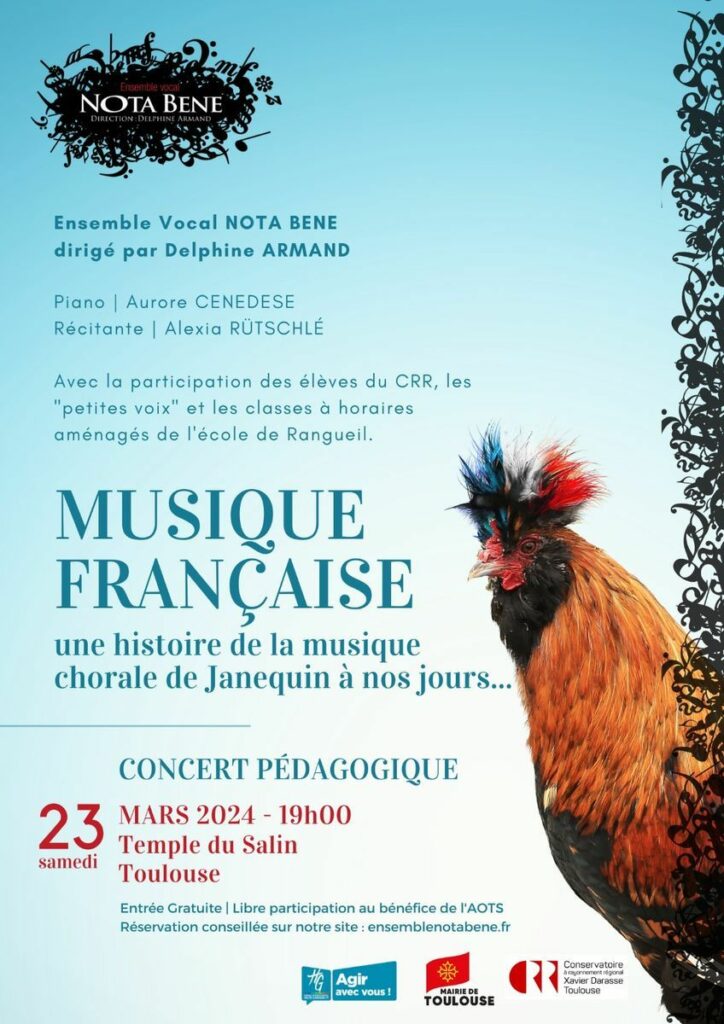 Le 23 mars prochain à 19 h, le Temple du Salin reçoit l’ensemble vocal toulousain Nota Bene, placé sous la direction de sa cheffe Delphine Armand. Ce concert pédagogique aura pour thème la musique française de Clément Janequin à nos jours. A noter que ce concert, pour petits et grands, sera gratuit.