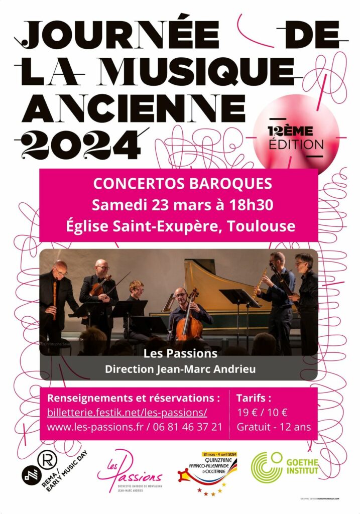 Informations pratiques concernant le concert du 23 mars en l’église Saint-Exupère, 6 rue Lamarck, 31400 Toulouse – Métro Palais de Justice, organisé dans le cadre de la Journée de la Musique Ancienne et de la Quinzaine franco-allemande, en partenariat avec le Goethe-Institut de Toulouse.