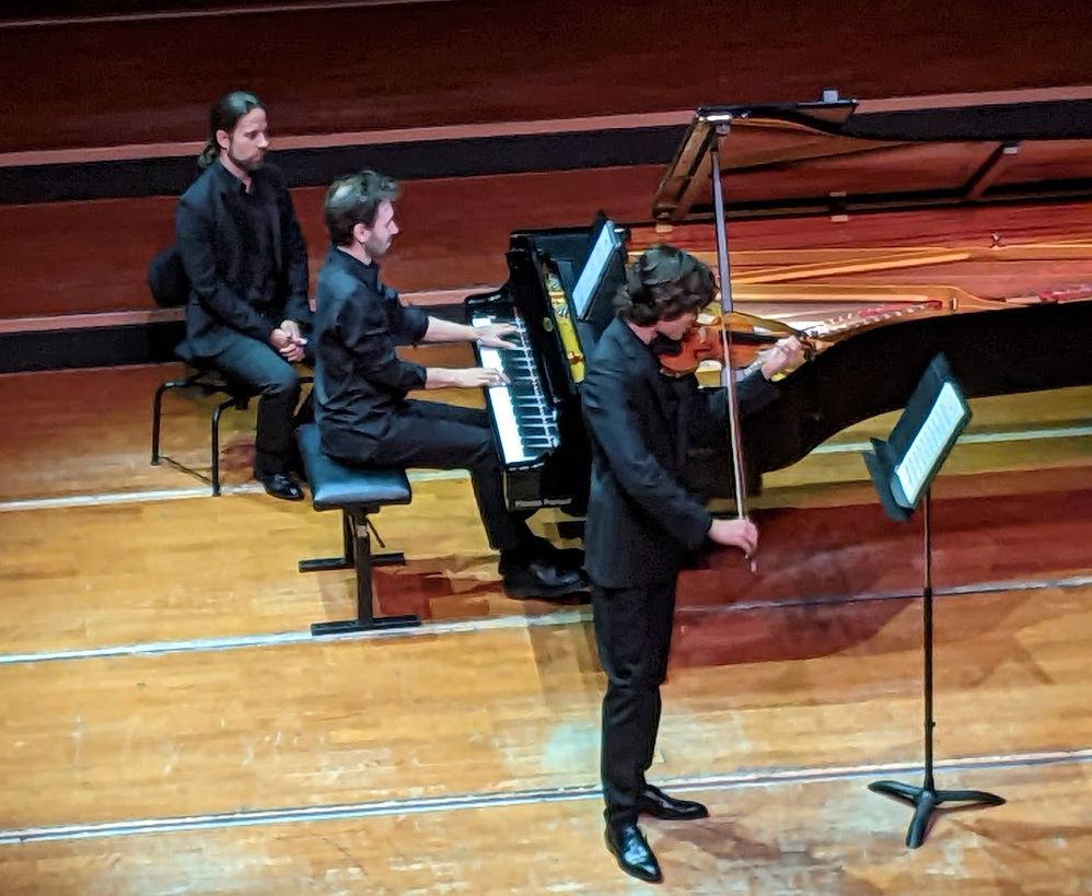 La seconde partie du concert réunit deux sonates pour violon et piano de compositeurs amis et emblèmes du romantisme germanique, Johannes Brahms et Robert Schumann. Ces deux partitions proches et néanmoins très caractéristiques de leurs auteurs sont données cette fois dans la continuité, sans interruption entre les deux. Curieusement, la salle reste silencieuse à la fin de la sonate de Brahms, entraînant un enchaînement avec celle de Schumann. Ce n’est qu’à l’issue de la seconde que les applaudissements éclatent en une grande ovation qui salue chaleureusement les deux exécutions. Il semble d’ailleurs (dixit les musiciens eux-mêmes) que ce phénomène se produisent chaque fois que ce programme est donné.