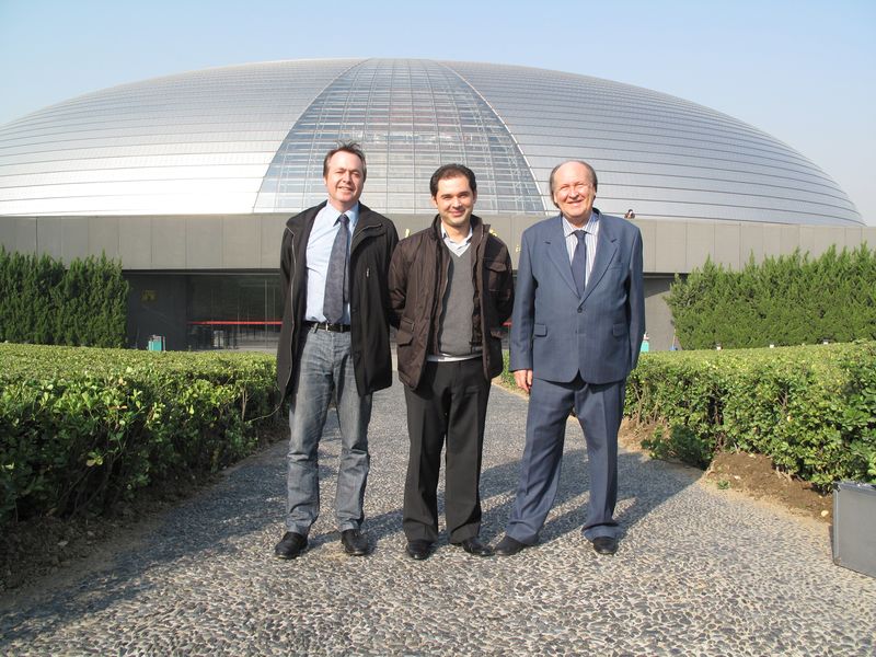 Tugan Sokhiev, directeur musical de l’Orchestre du Capitole, entre Jean-Christophe Sellin, délégué aux musiques de la municipalité de Toulouse et Claude Jacquemin, régisseur général de l’orchestre (de gauche à droite) devant le National Centre for the Performing Arts de Pékin