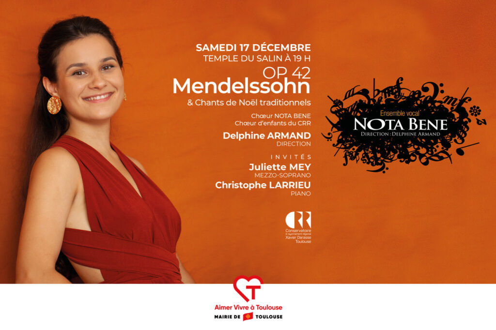 Le 17 décembre prochain, à 19 h au Temple du Salin, le chœur toulousain Nota Bene, placé sous la direction de Delphine Armand donne un concert avec la mezzo-soprano Juliette Mey et le pianiste Christophe Larrieu. Des chants traditionnels de Noël et le Psaume 42 de Felix Mendelssohn sont inscrits au programme.