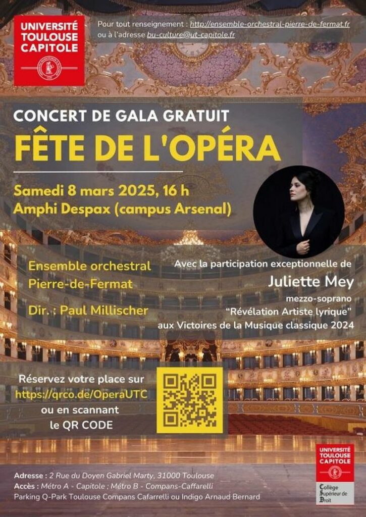 Après le succès remporté par les concerts de mars 2022 et mars 2024, la Mission Culture des bibliothèques de l’Université Toulouse Capitole propose un troisième concert de gala, « Fête de l’opéra ». Cette rencontre réunit l’Ensemble orchestral Pierre-de-Fermat, dirigé par Paul Millischer, et la jeune mezzo-soprano toulousaine Juliette Mey, « Révélation Artiste lyrique » aux Victoires de la Musique classique 2024.
