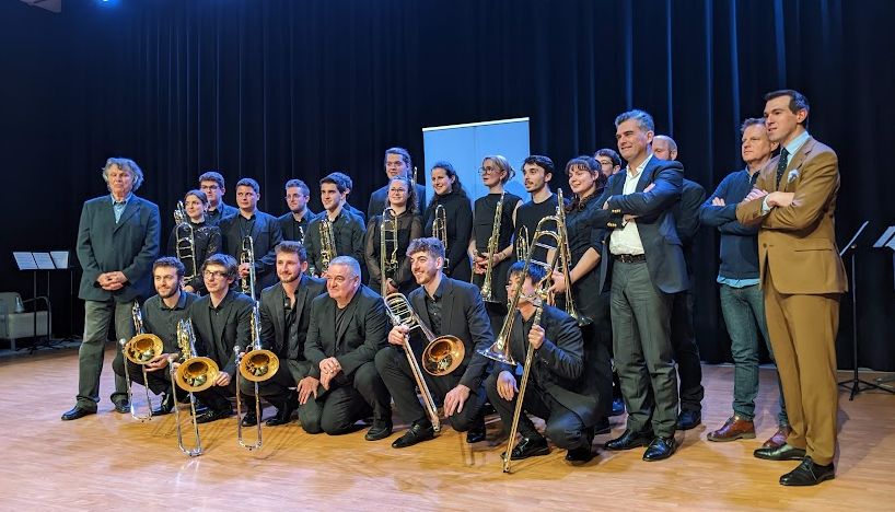 La soirée ne s’achève pas sur ce programme. Une troupe joyeuse de jeunes trombonistes envahit le plateau de la Halle aux Grains, se joint aux solistes et prolonge encore l’animation musicale en introduisant quelques éléments de jazz. Un moment rare et jubilatoire salué avec enthousiasme par un public galvanisé. La fête du trombone ne s’oubliera pas de sitôt !