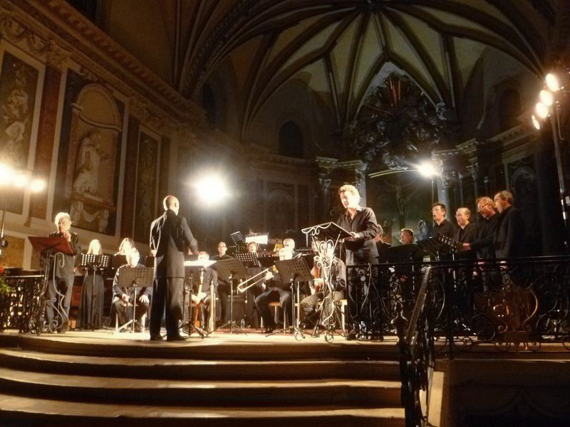 Le compositeur Patrick Burgan dirigeant les ensembles Les Sacqueboutiers, Scandicus et Quinte et Sens dans son épopée lyrique « 1213 – La bataille de Muret ».