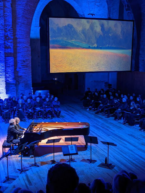 La première partie de la soirée s’ouvre sur un épisode pianistique d’hommage animé par le pianiste Rokas Zubovas et accompagné d’une présentation visuelle d’œuvres picturales de M. K. Čiurlionis.
