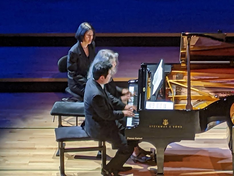 L’enthousiasme manifesté par le public entraîne, de la part des interprètes, l’offre abondante de deux bis. Ils jouent tout d’abord la transcription de György Kurtág pour piano à quatre mains de la Sonatina extraite de la Cantate BWV 106 Actus Tragicus, de Johann Sebastian Bach, comme un moment d’éternité. Ils se lancent ensuite dans l’interprétation de la Fantaisie en fa mineur pour piano à quatre mains, D. 940, de Franz Schubert. Un développement généreux qui entraîne une ovation debout de l’ensemble du public.
