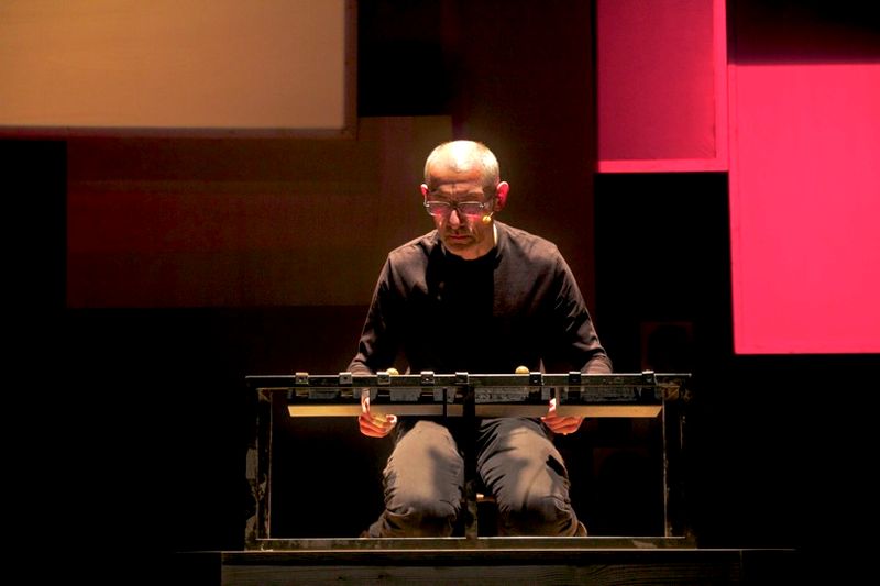En outre, un seul musicien-acteur-récitant agit sur scène, en symbiose totale avec cet « environnement électroacoustique interactif » qui donne vie au spectacle. Il s’agit du percussionniste Jean Geoffroy, sorte de Monsieur Loyal omnipotent, virtuose impressionnant de la série d’instruments mis à sa disposition, mais aussi acteur confondant de naturel et de précision. L’interaction entre son jeu vivant et les éléments préenregistrés diffusés par le système sonore et vidéo se manifeste sans couture apparente.