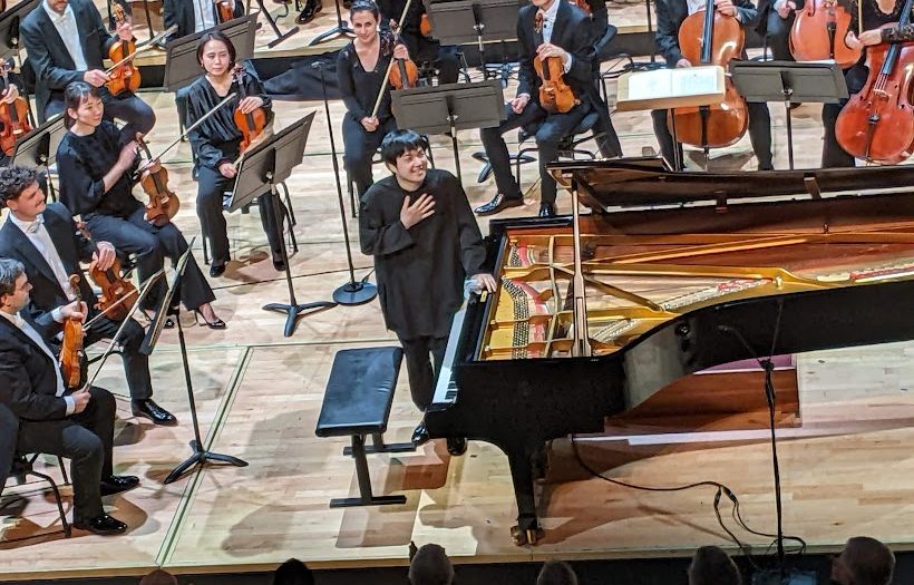 Le contraste n’est pas mince avec la partition suivante ! Le Concerto pour piano n° 1 en mineur, de Frédéric Chopin (en réalité le second chronologiquement composé) est interprété en soliste par le jeune pianiste japonais Mao Fujita. L’introduction orchestrale dirigée avec ferveur déploie un véritable tapis rouge à l’entrée du piano. Il faut souligner que tout au long de cette interprétation, le dialogue entre le soliste et l’orchestre atteint les plus hauts niveaux d’échange, tant au niveau sonore qu’à celui des affects. Le jeu de Mao Fujita, d’une extrême sensibilité, confère à l’œuvre des plages de tendresse et de poésie qui alternent avec un élan virtuose jamais gratuit. Le sens des nuances nourrit en permanence son jeu, habilement soutenu et accompagné par l’orchestre. Après le rêve qui imprègne toute la Romance, le Rondo final pétille de vivacité sans jamais céder à une quelconque facilité.