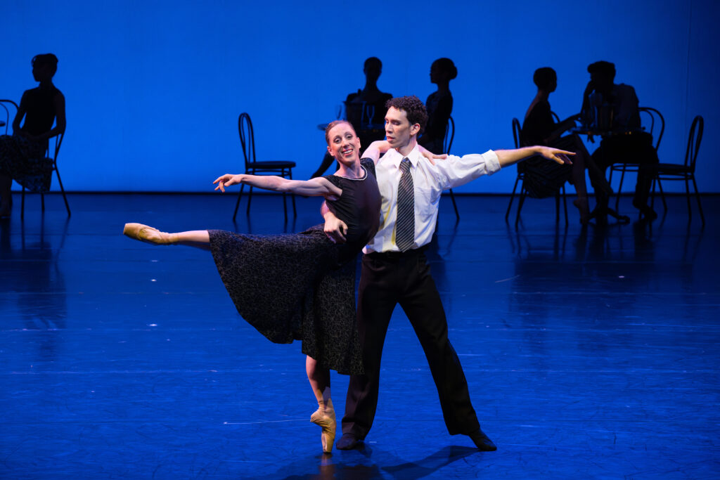 Tout autre était la création de la jeune chorégraphe anglaise Morgann Runacre-Temple, sur cinq chansons de Barbara, première œuvre originale conçue pour une compagnie française. Dès l’ouverture du rideau, on plonge dans une pénombre où seule rayonne l’orange voilé d’un abat-jour frangé d’une lampe, laissant deviner un profond fauteuil bordeaux. Une atmosphère qui convient parfaitement à la musique douce-amère qui accompagne la voix de Barbara murmurant la mélancolie d’un texte. La chorégraphie mêle néo-classique et contemporain dans une danse fluide, presque liquide. Les danseurs se croisent, se frôlent, s’enveloppent, glissent ; les groupes se forment pour mieux s’abandonner. Parfois la grammaire classique souligne une arabesque sur le bout d’une pointe. Le travail au sol déroule ses méandres, puis les bras se cassent, les couples se forment dans des étreintes fugaces. On retrouve la « Dame en Noir » dans les costumes d’un noir profond qui, parfois, s’éclairent de paillettes, de cuir ou de transparences ciselées. Les danseurs expriment singulièrement les émotions que distillent les textes ouvragés de Barbara. Natalia de Froberville et Philippe Solano, Marlen Fuerte et Alexandre de Oliveira Ferreira sont remarquables dans le Nantes qu’ils dansent sur une version instrumentale jouée de main de maître par Christophe Larrieu. Mais il en est de même pour Kayo Nakasato et Minoru Kaneko, Solène Monereau, liane ondulante, Juliette Itou, Jeremy Leydier ou Simon Catonnet dans Du bout des Lèvres. La chorégraphe n’a pu nous donner que cinq des chansons de Barbara sur les sept qui auraient dû figurer au programme. Gageons que nous la retrouverons très vite pour nous présenter son ballet complet.