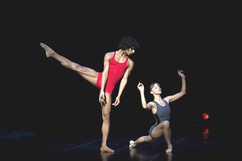 Suivait Webern opus V, évidemment sur l’intégrale du quatuor à cordes opus V que Webern composa en 1909. Créé en 1966, cette œuvre, sans trame narrative, réunit une fille et un garçon, les deux en collants blancs. Véritable miroir de la partition, ce duo, dans une grammaire chorégraphique académique parfois atomisée, s’unit et se désunit dans une fluidité de mouvements vertigineuse. Daria Ivanova et Paul Knobloch sont les interprètes rigoureux et inspirés de ce ballet d’une redoutable difficulté.