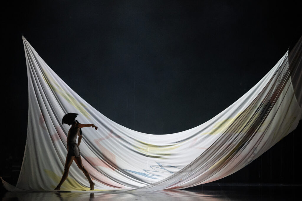 Sébastien Ramirez et Honji Wang, deux chorégraphes issus du hip-hop et de la danse urbaine et évoluant vers une danse contemporaine affirmée, avaient choisi « l’Après-midi d’un faune », toile peinte d’après un dessin de Picasso, pour la reprise à l’Opéra de Paris, en 1965, par Serge Lifar de ce ballet et d’Icare, représentant un faune poursuivant une nymphe. Ce rideau fut exécuté et finalement présenté au Théâtre du Capitole à Toulouse, où il ne fit pas l’unanimité du public, loin s’en faut. Le rideau de scène est remplacé ici par une toile légère délicatement peinte et qui devient, par la magie des mains d’Alexandre de Oliveira Ferreira qui le manipule, le partenaire évanescent des danseurs. A la partition originale de Debussy les chorégraphes y ont intégré des éléments musicaux plus contemporains. Les deux nymphes,  Marie Varlet et Saki Isonaka, jouent avec le voile léger dans une chorégraphie sensuelle et troublante, très fluide et parfois désarticulée. Leur féminité et leur grâce s’opposent   à l’animalité, la « lourdeur » suggestive des deux faunes Amaury Barreras Lapinet et Simon Catonnet. Commence alors une danse des deux couples qui se fuient, se reniflent, se caressent tour à tour. L’entrée de Rouslan Savdenov juché sur des sortes de sabots de faune surélevés (une vraie performance pour ce danseur) nous présente la figure du Minotaure, si présente dans l’œuvre de Picasso, fige les danseurs qui deviennent des pantins sous sa pique qui n’est pas sans rappeler celle du picador, figure également chère au peintre. La chorégraphie de Ramirez et Wang nous apparaît plus contemporaine que celle plus urbaine, plus proche du hip-hop qui est leur marque habituelle.