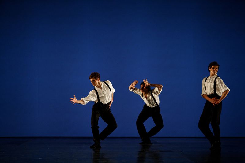 Trois filles avaient démarré la soirée, il revient à trois garçons de la clore. Ce sera avec Aunis, sur une chorégraphie de Jacques Garnier (1979) et une musique de Maurice Pacher, d’ailleurs présent avec son accordéon diatonique. Sur des rythmes alternant valse, tango, gigue, et des pas se souvenant du folklore saintongeais, pays d’origine du chorégraphe, Axel Ibot, Daniel Stokes et Mickaël Lafon semblent regarder avec une nostalgie, pleine d’une émotion qu’ils nous font subtilement partager, vers un passé irrémédiablement entré dans les brumes du souvenir, celui de l’enfance.
