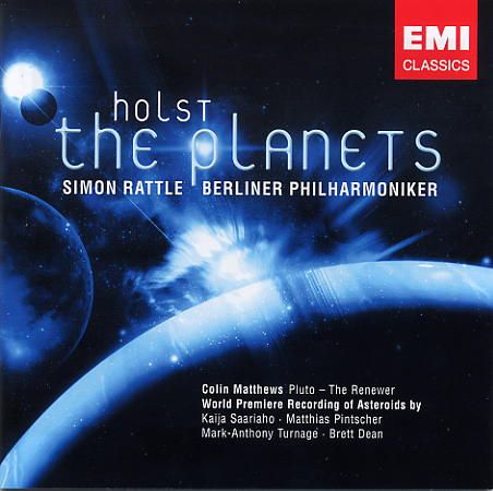 Tout récemment, Sir Simon Rattle, au nom de la Philharmonie de Berlin, passa commande de quatre pièces supplémentaires sur le même thème des planètes auprès de quatre compositeurs d’horizons divers. La finlandaise Kaija Saariaho, l’allemand Matthias Pintscher, l’anglais Mark-Anthony Turnage et l’australien Brett Dean se sont donc attachés à prolonger le monde musical de Holst par quatre pièces originales et très évocatrices. Tout cet ensemble cohérent fait ainsi l’objet d’un double album CD dans lequel la Philharmonie de Berlin et son directeur musical, Simon Rattle, renouvellent le propos de Gustav Holst.