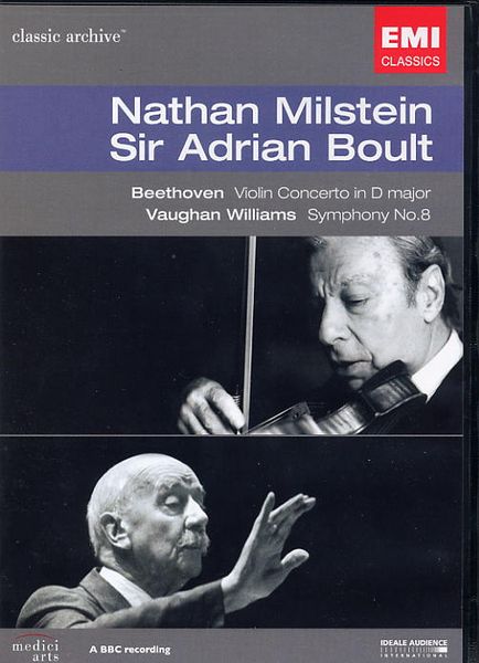 Deux des plus grands musiciens du 20ème siècle sont les vedettes d’un DVD que publie EMI. Le violoniste d’origine russe Nathan Milstein fut un véritable prince de l’archet. Né à Odessa en 1903, il mourut à Londres en 1992. Véritable perfectionniste de son instrument, il a laissé des interprétations exemplaires des grands chefs d’œuvres du répertoire, dont la musicalité et le raffinement, caractérisent un jeu très personnel, une sonorité de miel. Le voici filmé lors d’un concert public donné à Londres en 1972 dans le fameux Albert Hall. Il y interprète le concerto pour violon et orchestre de Beethoven, dans lequel il déploie un charme intimiste et profond. Contrairement à l’habitude, Milstein n’emprunte pas les cadences composées par Fritz Kreisler, mais joue ses propres cadences, comme cela était d’usage à la création. Il est « accompagné », le mot est faible ici, par un chef britannique qui a marqué le siècle de son empreinte, Sir Adrian Boult. Mort en 1983 à un âge « avancé », ce chef officiel de la couronne, a joué un rôle fondamental dans la diffusion de compositeurs peu visités en son temps. Ce fut le cas de Gustav Mahler dont il délivra des interprétations historiques. Il fut aussi le défenseur naturel des compositeurs anglais du 20ème siècle : Britten, Elgar, Tippett… Outre sa direction profonde et ample du concerto de Beethoven, on peut apprécier sur ce DVD son interprétation hautement idiomatique de la symphonie n° 8 de Ralph Vaughan Williams, enregistrée également en 1972 dans l’Albert Hall. Une musique forte et particulièrement bien structurée qui mérite mieux que l’absence des salles de concert qui la caractérise. La direction de Sir Adrian, immense baguette à la main, est une leçon de sobriété et de musicalité. Un grand bravo au London Philharmonic Orchestra, aux destinées duquel Sir Adrian présida pendant des décennies.