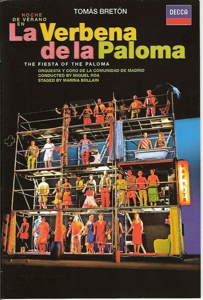 Dès sa création en 1894 au Théâtre Apolo de Madrid, La Verbena de la Paloma, musique de Tomas Breton sur un livret de Ricardo de la Vega, connut un succès énorme qui ne s’est jamais démenti. Cette zarzuela en un acte d’à peine plus d’une heure (le fameux género chico), est le modèle même de ce genre d’œuvre puisant ses rythmes et ses personnages dans ce que Madrid comptait de plus typique parmi ses classes populaires au 19ème siècle. Le titre fait référence aux fêtes madrilènes du 15 août célébrant la Vierge à la Colombe de Madrid fêtes auxquelles les habitants d’un petit immeuble doivent se rendre. C’est ainsi que dans une joyeuse, sympathique et amicale promiscuité se croisent un pharmacien, un coiffeur, un livreur de Butagaz, un barman et quelques plus ou moins jeunes femmes. Pour faire simple !Après bien des cris et des grincements de dents, des bouderies et des jalousies, tout ce petit monde se retrouvera pour un happy end en musique au cœur même de ces fameuses fêtes. Seguidillas, soleares gitanas, coplas, mazurka, habaneras, rumba et bomba se succèdent à un rythme infernal, d’autant que l’ Orquesta y Coro de la Comunidad de Madrid, sous la direction experte de Miguel Roa, s’en donnent à cœur joie dans un répertoire qui leur appartient complètement.Le présent dvd est le témoignage d’une représentation donnée en 2006 au Teatro Auditorio de San Lorenzo d’El Escorial. Sur scène, que de l’authentique et du solide dirigé par Marina Bollain. Celle-ci transpose l’action à notre époque avec un bonheur sans mélange, prouvant l’éternité de cette musique, de ce genre et des messages que la zarzuela contient.A voir et à écouter un verre de sangria à la main !