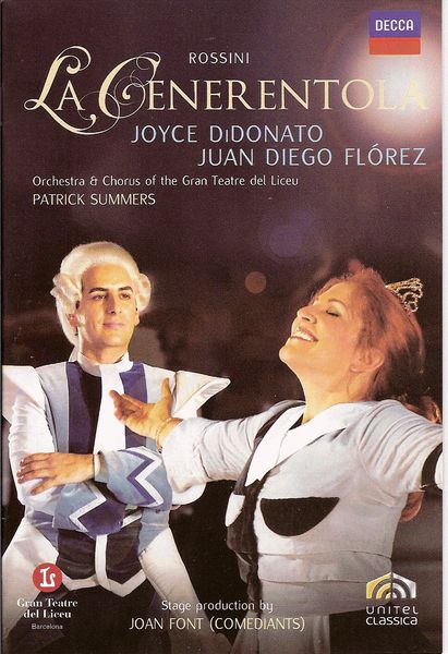 Janvier 2008, le célébrissime Liceu de Barcelone invite les deux interprètes les plus prestigieux de notre temps pour chanter ce chef d’œuvre rossinien, dans le style bouffe, qu’est La Cenerentola : Joyce DiDonato et Juan Diego Florez. Ils vont être fidèles à leur réputation, nous donnant à entendre ce qui se fait de plus beau en matière belcantiste de nos jours. Difficile de parler de perfection, et pourtant, comment faire avec la mezzo américaine Joyce Didonato ? Du timbre mordoré et velouté au phrasé somptueux en passant par une musicalité omniprésente, un style intouchable et cette douceur dans la voix qui renvoie bien au personnage d’Angelina en permanence, tout nous ramène inexorablement vers les frontières de l’idéal.A ses côtés, le ténor péruvien, dans l’un de ses rôles « carte de visite », incarne un Prince qui, lui aussi, tutoie la perfection. Timbre de soleil, virtuosité de la colorature, style impeccable, un ambitus d’une parfaite homogénéité lui autorisant des notes stratosphériques, que souhaiter de mieux ? Dans cet opéra, aucun autre duo, y compris au disque, ne peut lui être comparé. C’est tout dire. Saluons également Cristina Obregon (Clorinda) et Itxaro Mentxaka (Tisbe) et les trois clés de fa, parfaitement au diapason de ce spectacle de très haut niveau : David Menéndez (Dandini), Bruno de Simone (Don Magnifico) et Simon Orfila (Alidoro). Il faut applaudir aussi l’excellente direction de Patrick Summers, actuel directeur musical du Houston Grand Opera, une direction bourrée d’intention, de fluidité, de couleurs, et en même temps une mécanique d’une précision absolue dont les phalanges musicales et chorales du Liceu se font les parfaites interprètes.Joan Font et ses Comediants ainsi que les décors et costumes de Joan Guillén nous entraînent définitivement, quant à eux, dans une vision très Lewis Carroll, au cœur d’un monde de rêve et de bande dessinée. Avec une magnifique pirouette finale…Assurément la vidéo de référence de cet ouvrage. Et pour longtemps !