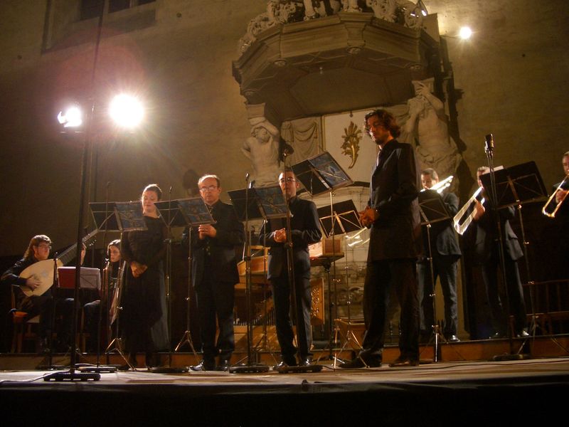 Les Sacqueboutiers et les quatre chanteurs de la soirée Schütz. De gauche à droite :