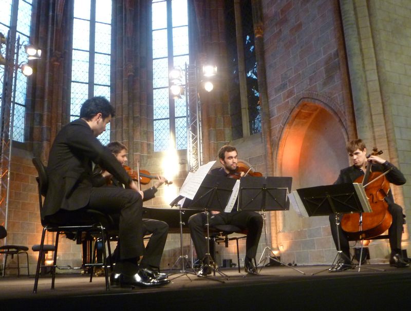 Une fois de plus, le jeune Quatuor Modigliani enthousiasme le public nombreux du festival Toulouse d’Eté. Invités pour la quatrième fois par Alain Lacroix, le directeur de la manifestation estivale, ces quatre musiciens surdoués maintiennent ainsi leurs liens avec la ville rose qui a hébergé leur formation initiale et qui se réjouit de leurs succès internationaux. Après un premier concert donné en cette fin d’après-midi d’un 23 juillet de canicule, les Modigliani concluent la soirée en s’associant avec cet autre grand et jeune artiste d’origine toulousaine, le pianiste Adam Laloum, lui aussi largement adopté par le public international. Les deux concerts se déroulent dans la salle capitulaire du légendaire cloître des Jacobins.