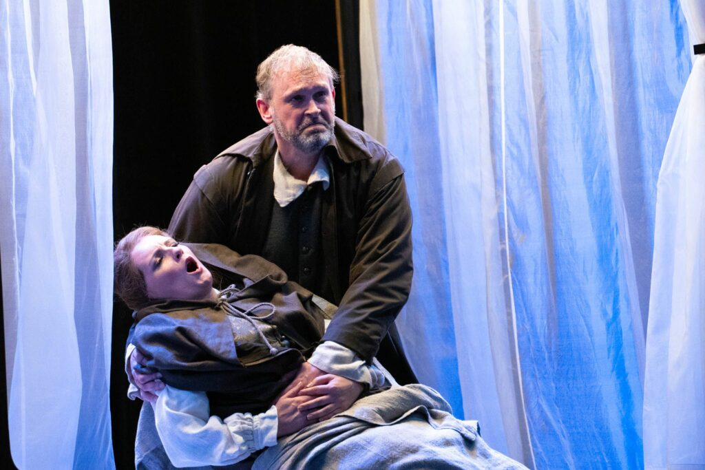 L’ouvrage se donne sur une scène de 20 mètres carrés et avec pour unique accompagnement un piano tenu par le directeur musical et artistique de cette troupe, l’incroyable Bryan Evans. J’écris incroyable car, sans se départir de son sourire presque enfantin, ce musicien d’exception déroule avec une précision fabuleuse l’intégralité de la partition, sans temps mort aucun et avec toujours ce souci de coller au plus près de l’action. Une véritable performance qu’il convient de saluer en tant que telle. Sur scène, juste un trône, celui du Duc. C’est autour de lui et d’un praticable en forme de baldaquin, que se déroule la mise en scène signée Wayne Morris. Dans cet espace, vous en conviendrez, assez réduit, le drame va se nouer de manière imparable et nous prendre à la gorge. La proximité des interprètes et du public, conjuguée à l’indéniable talent scénique de toute cette troupe, nous font vibrer à ce drame sacrificiel avec une intensité dont nous sommes chaque fois, en ce lieu, les premiers surpris. Quelle que soit l’œuvre représentée d’ailleurs.