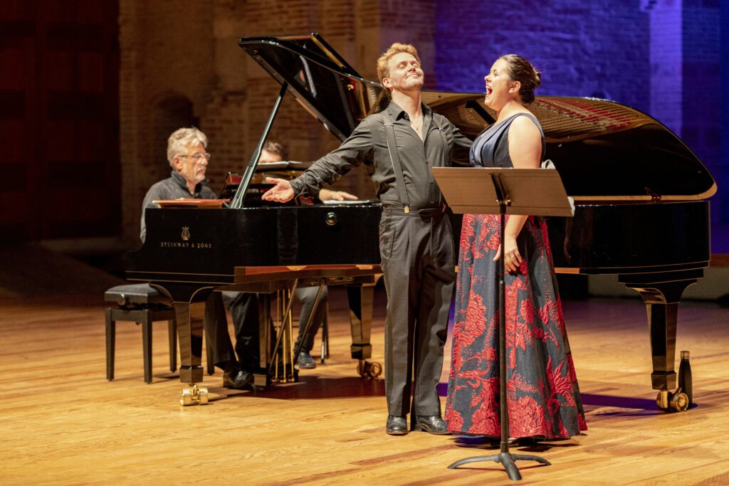 En invitant la soprano montalbanaise Anaïs Constans et le ténor toulousain Kevin Amiel, Julien Martineau, directeur artistique du Festival de Toulouse, ouvre la porte de sa manifestation à deux enfants de la culture lyrique régionale. Ils ont en effet étudié le chant au Conservatoire à Rayonnement régional de la Ville rose. Aujourd’hui, ces deux trentenaires sont dans la carrière. Ces dernières saisons, au Capitole, Anaïs Constans a chanté Susanna, Mimi, Pamina et Micaëla entre autres emplois. Kevin Amiel s’est vu confier, sur la scène capitoline, Almaviva, Nemorino et Alfredo, pour ne citer que ces rôles-là.  Les voilà tous les deux en l’Auditorium Saint-Pierre-Des-Cuisines, pour l’une des dernières manifestations du Festival de Toulouse édition 2023, ce chaud lundi 10 juillet, accompagnés du piano complice de Jean-Marc Bouget.
