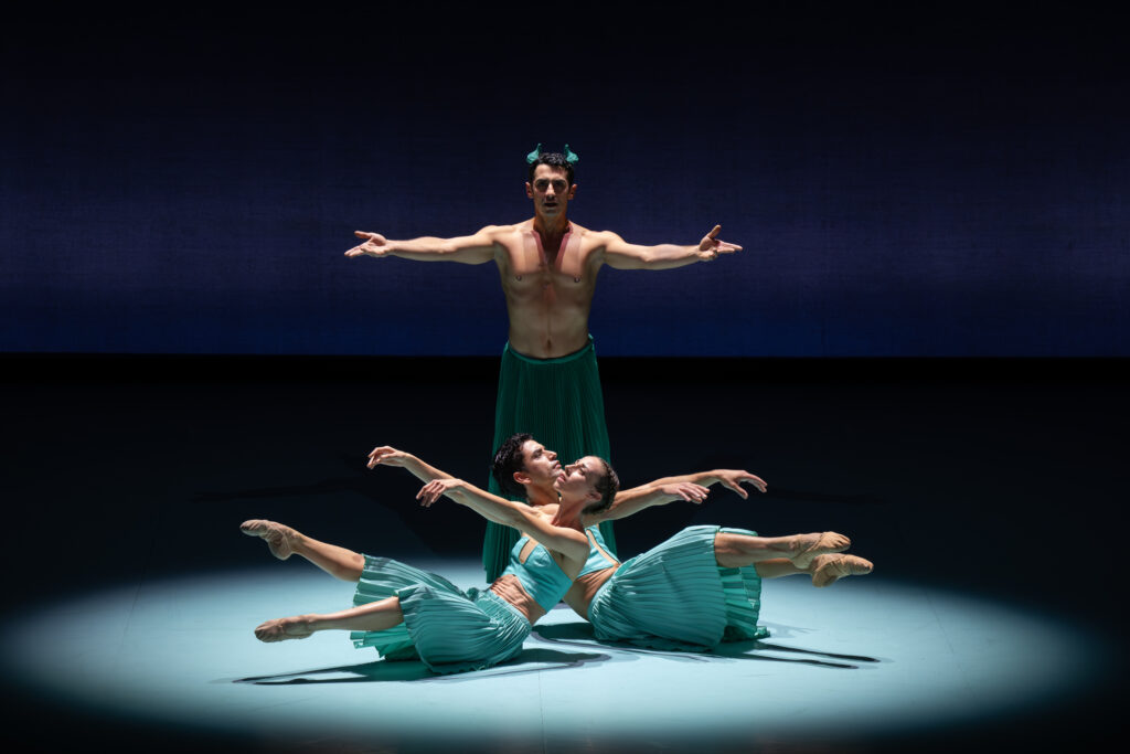 La chorégraphie n’est pas sans rappeler les frises des temples grecs ou égyptiens. Mais, bien qu’harmonieuse, cette géométrie nous semble bien répétitive, nous rappelant parfois les rondes enfantines de nos cours de récréation. Natalia de Froberville et Ramiro Gómez Samón interprétaient les deux protagonistes lors de la première distribution. Leur complicité sur scène est toujours aussi manifeste. Solène Monnereau et Kleber Rebello leur succédaient pour la deuxième distribution, et leur duo fut parfait. La haute stature d’Alexandre De Oliveira Ferreira nous donna à voir un dieu Pan solennel et bienveillant, tandis que celui de Philippe Solano nous apparu tout aussi bienveillant, mais peut-être plus proche de l’humain dans son interprétation. La sulfureuse Lycénion fut dansée alternativement par Tiphaine Prévost, aguicheuse en diable, et Kayo Nakasato royale. Quant à Jérémy Leydier, il fut, lui aussi, parfait dans le rôle de Dorcon.