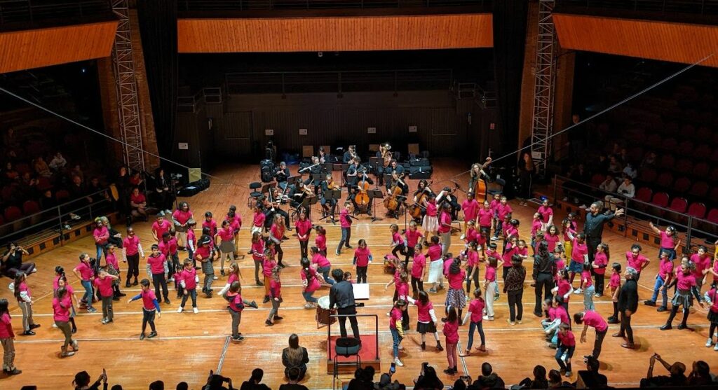 À la rentrée 2022, une centaine d’enfants issus de la métropole et du Département a intégré pour trois ans la deuxième édition de ce dispositif en Haute-Garonne. Après une première initiation au chant et à la musique, ces jeunes musiciennes et musiciens ont donc été accueillis ce samedi 14 janvier 2023 sur la scène de la Halle aux Grains afin d’y recevoir leurs instruments, en présence des familles et des autorités impliquées. Le chef d’orchestre Christophe Mangou encadrait et dirigeait cette foule bigarrée de jeunes enfants ainsi que l’ensemble instrumental des musiciens professionnels chargés d’encadrer les jeunes stagiaires.