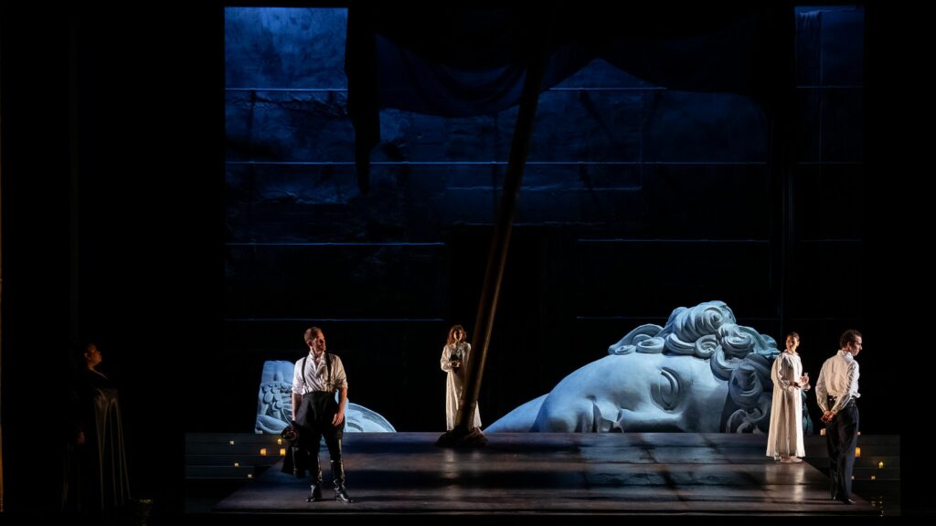 Devant une salle confortablement garnie, l’œuvre du compositeur britannique nous a été présentée dans le cadre d’une nouvelle production. Le décor, signé Hernán Penuela, est avant tout un proscenium rehaussé de quelques marches et surplombé de voiles déchirées. Un gigantesque mât aux inclinaisons variables aura tôt fait de se transformer en croix, ajoutant ainsi à la vision carrément christique de l’œuvre telle que conçue par Anne Delbée (mise en scène). De magnifiques costumes, plus particulièrement celui de Lucrèce, signés Mine Vergez, et des éclairages d’une formidable efficacité (Jacopo Pantani) achèvent de donner à ce spectacle une aura universelle, intemporelle et finalement profondément humaine.